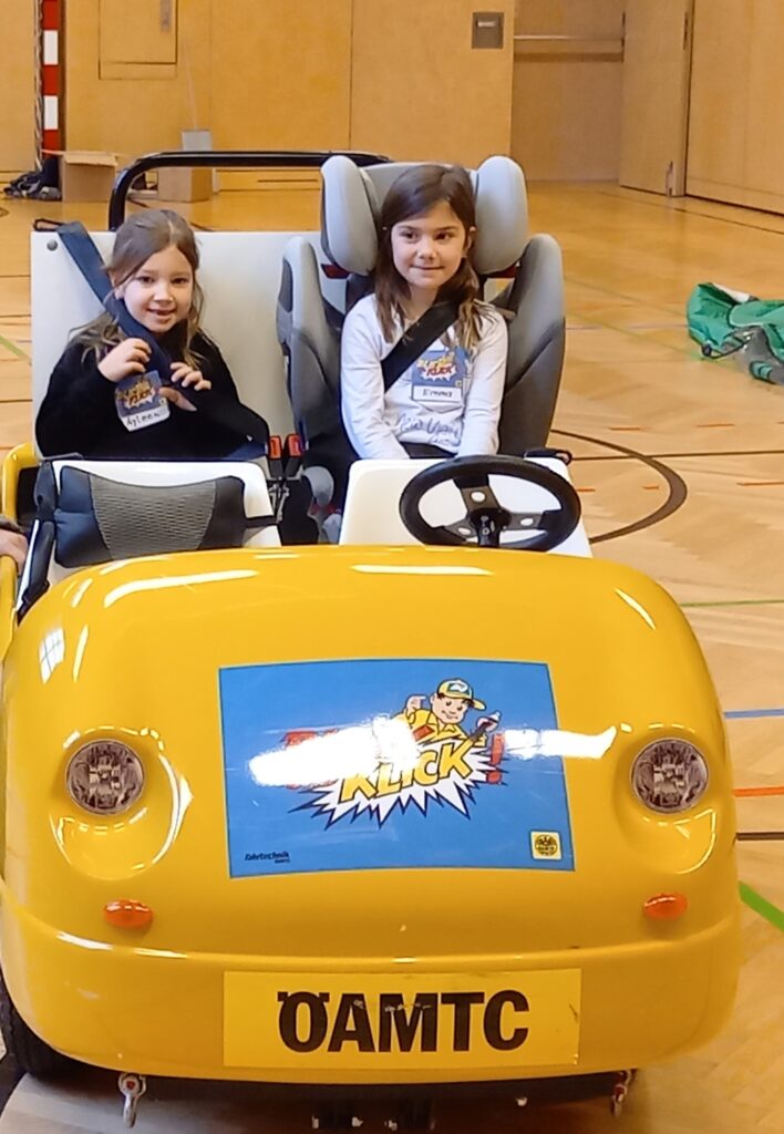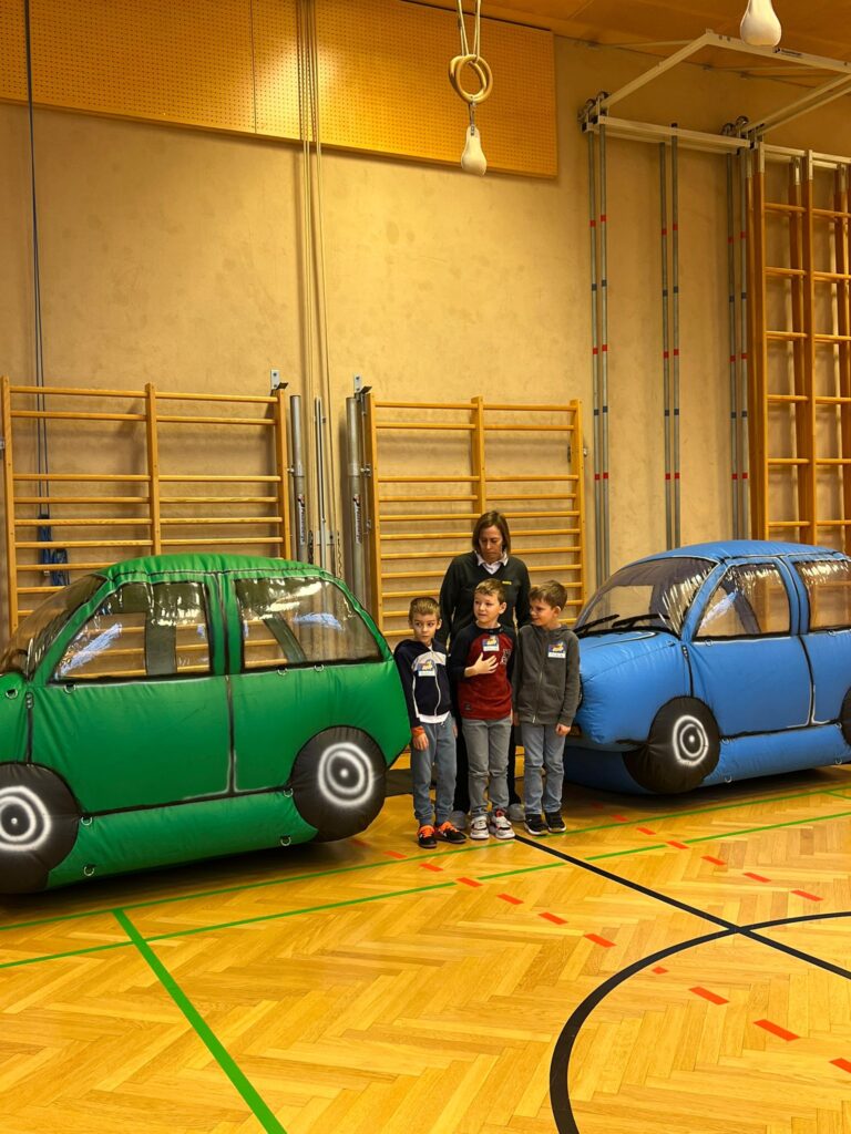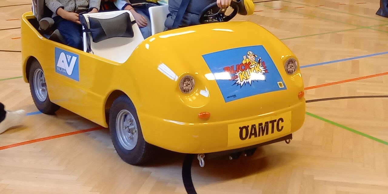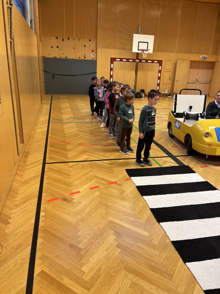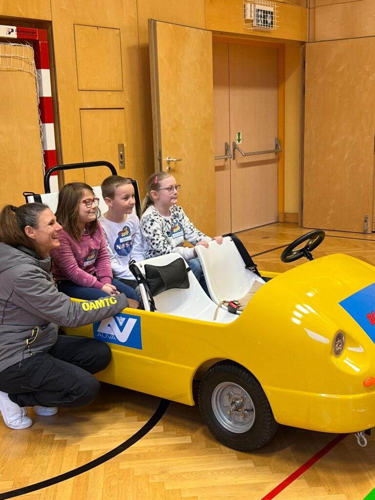 Die ersten Klassen bekamen im Jänner Besuch vom ÖAMTC. Der Turnsaal wurde zu einer Straße umfunktioniert. Spielerisch wurde das sichere Verhalten am Schulweg trainiert. Abschließend durften sogar alle im Elektroauto mitfahren. Das war ein Spaß!