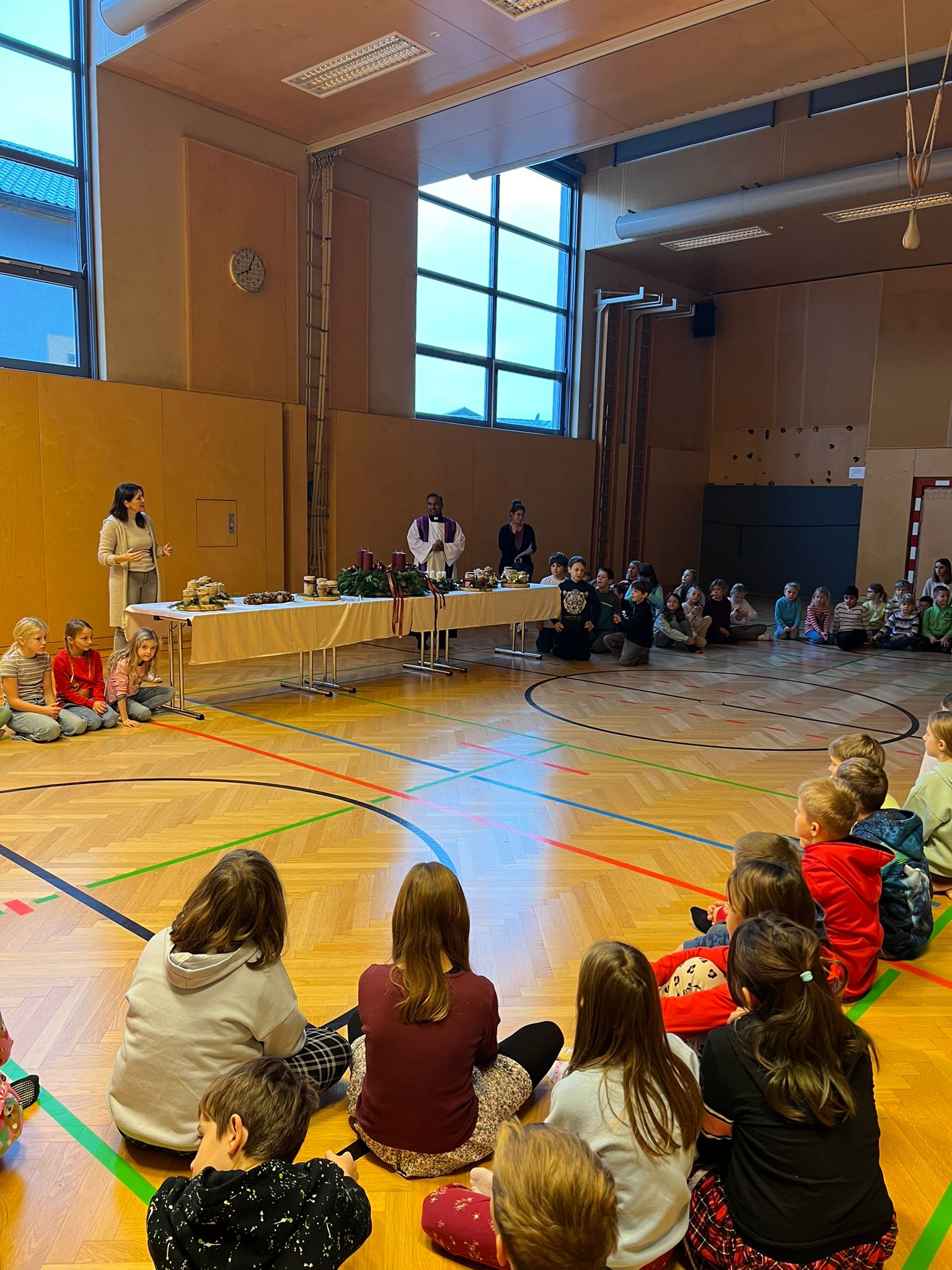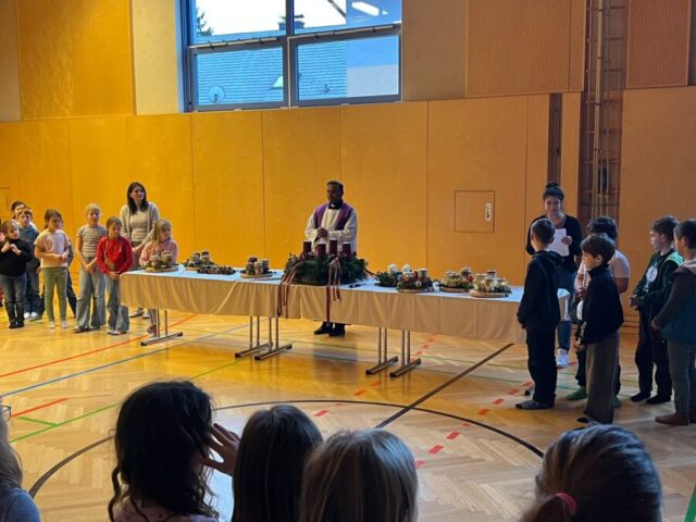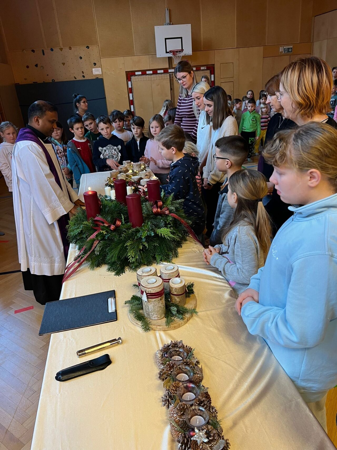 Zur Einstimmung in die Adventzeit feierten wir in der ersten Dezemberwoche gemeinsam mit unserem Herrn Pfarrer die Adventkranzweihe. Jede Klasse brachte ihren Adventkranz mit und die erste Kerze wurde von einem Kind feierlich angezündet. Begleitet von wundervollen Adventliedern kam schon richtige Weihnachtsvorfreude auf!