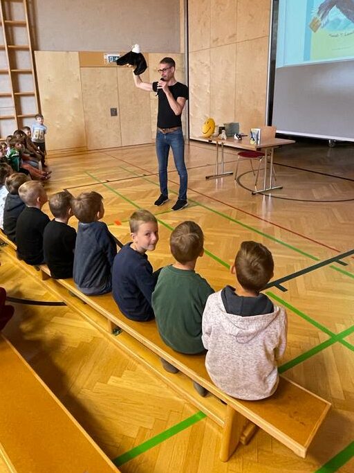 Im Vorlesemonat Mai stellte der Autor Jonathan Mittermair sein Buch “Der Adler Aaron” vor. Bei diesem Mitmachbuch sollen die Kinder mithilfe des Erfolgstagebuchs ihr Selbstbewusstsein stärken und noch mehr Mut gewinnen.
